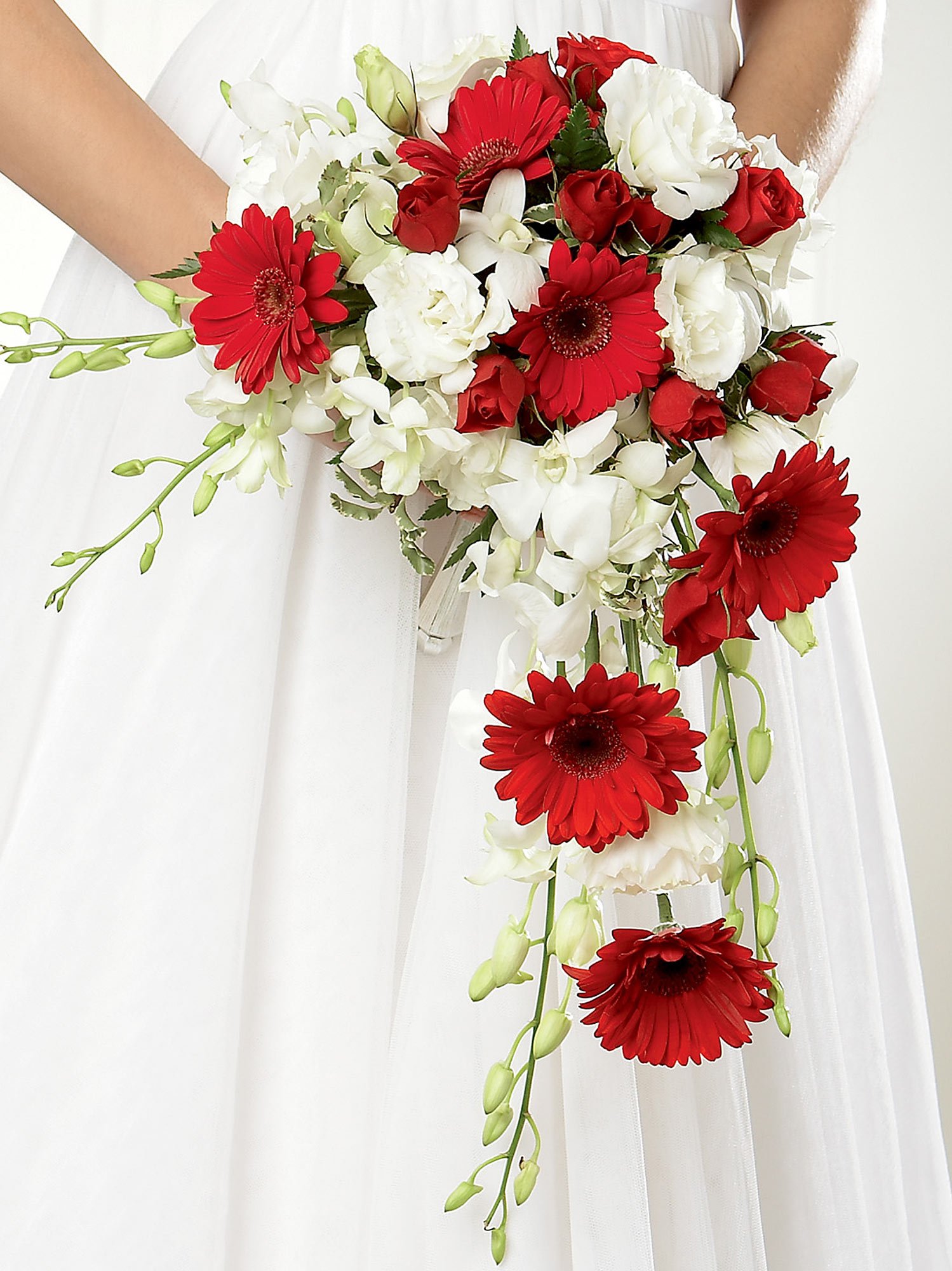 Every bride needs a magnificent bouquet and this crimson and white shower bouquet of gerberas and orchids is a wonderfully grand statement. The bright crimson works beautifully with purest white. This is contemporary styled bridal bouquet that is guaranteed to make an impression.