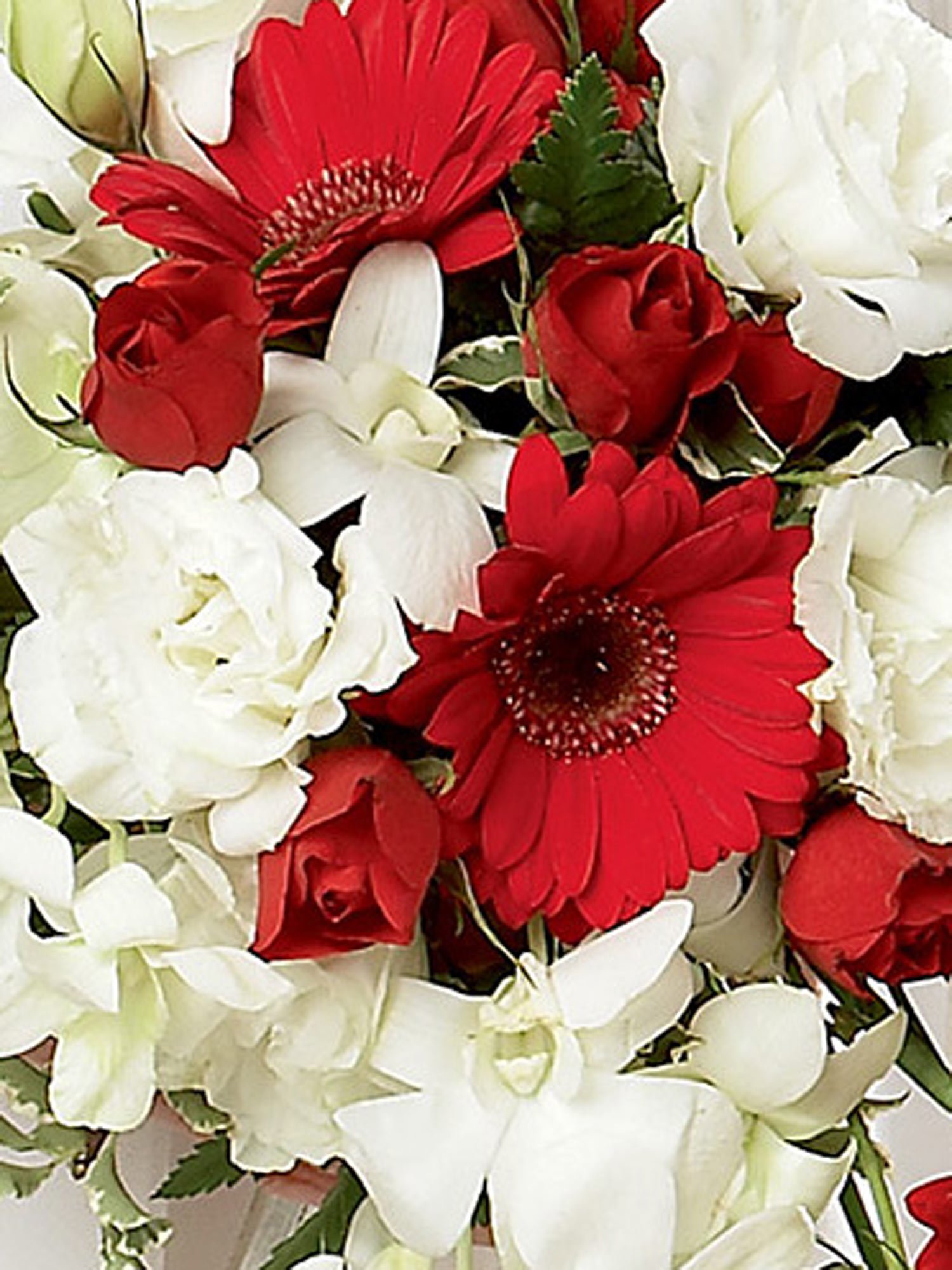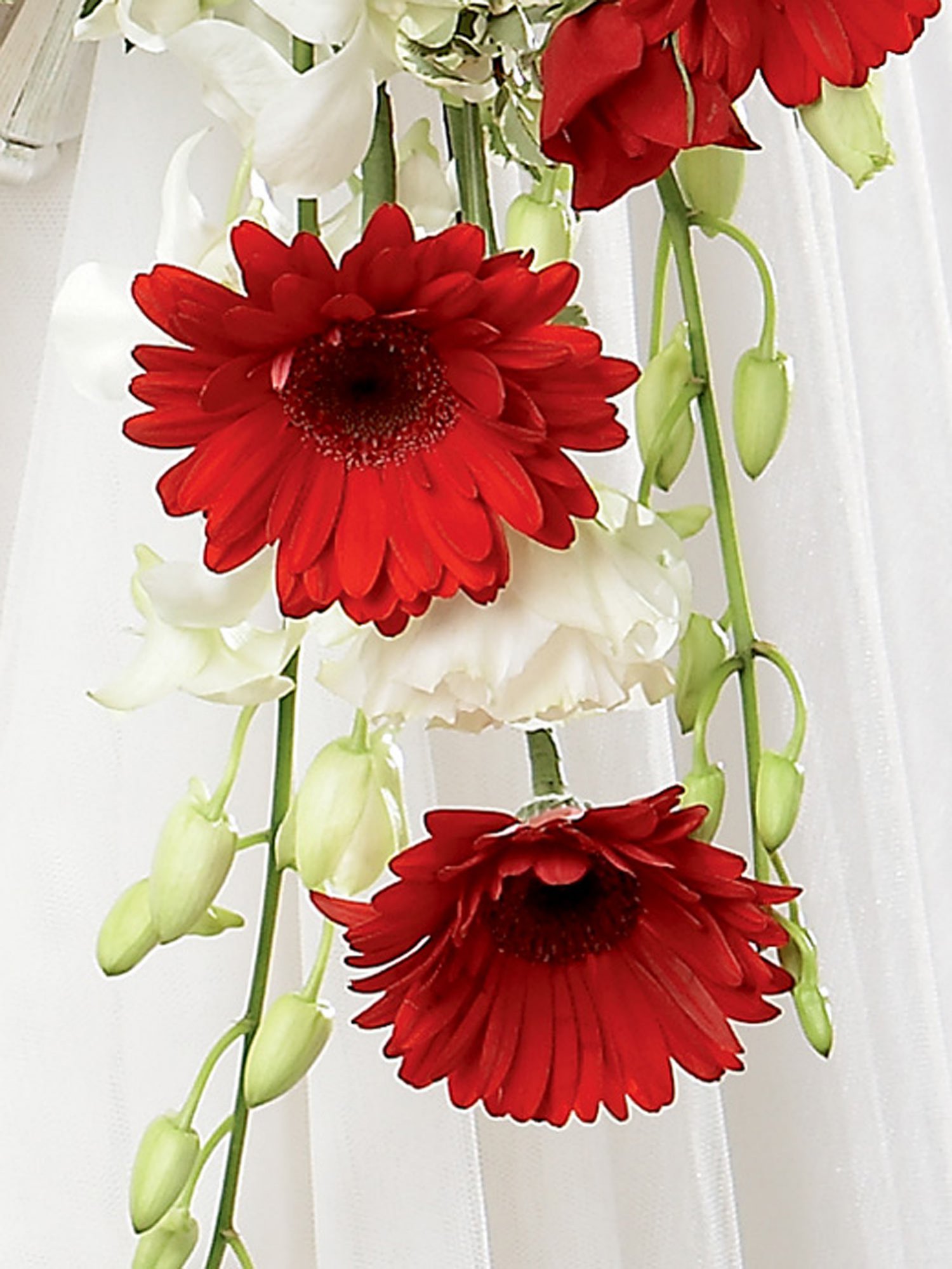 Featuring 7 white dendrobium orchids, 6 red gerbera, 3 white double lisianthus and 4 red spray roses with pittosporum and a bouquet holder. This hand-held bouquet is approximately 33cm (w) x 61cm (l).
