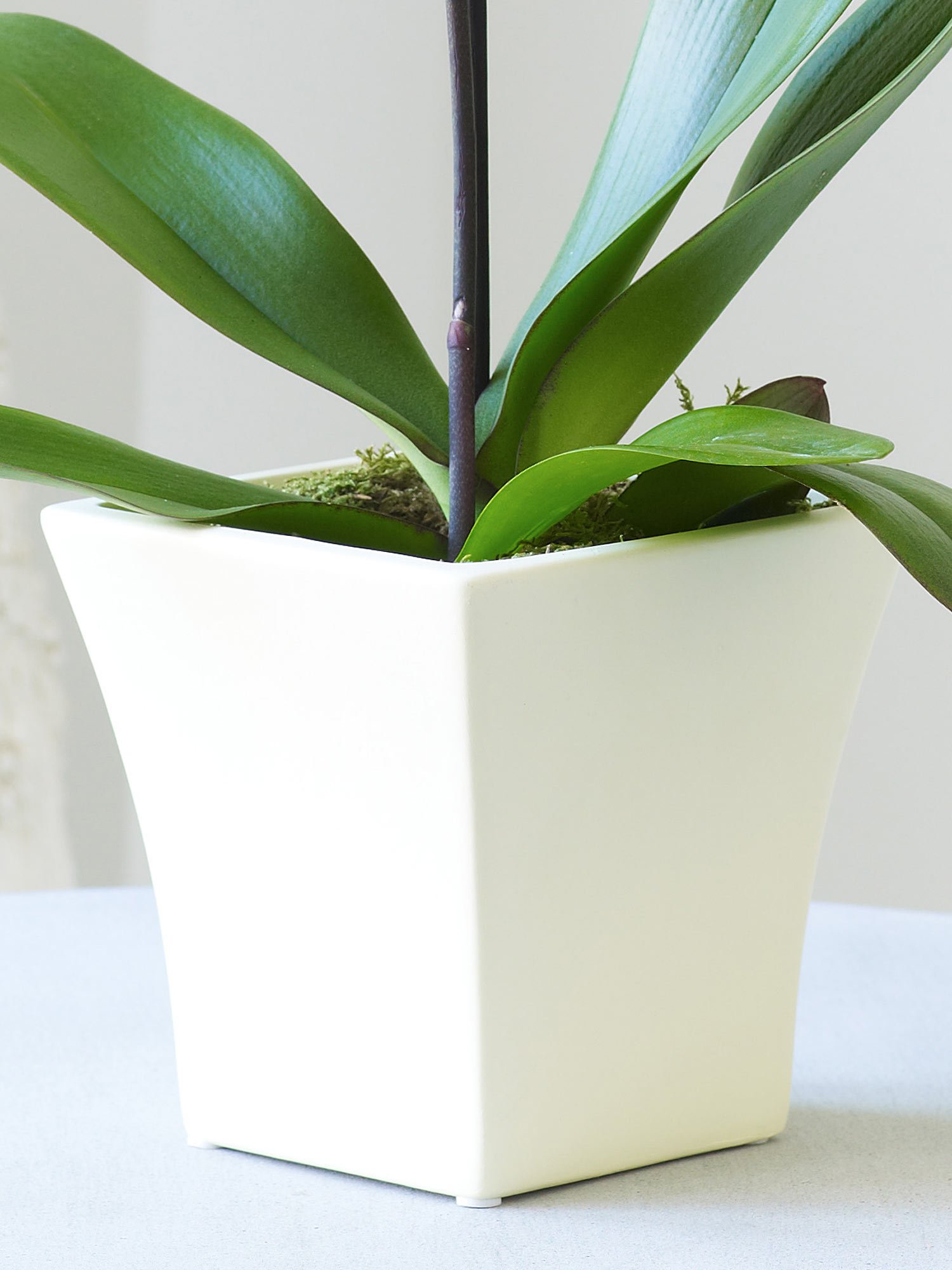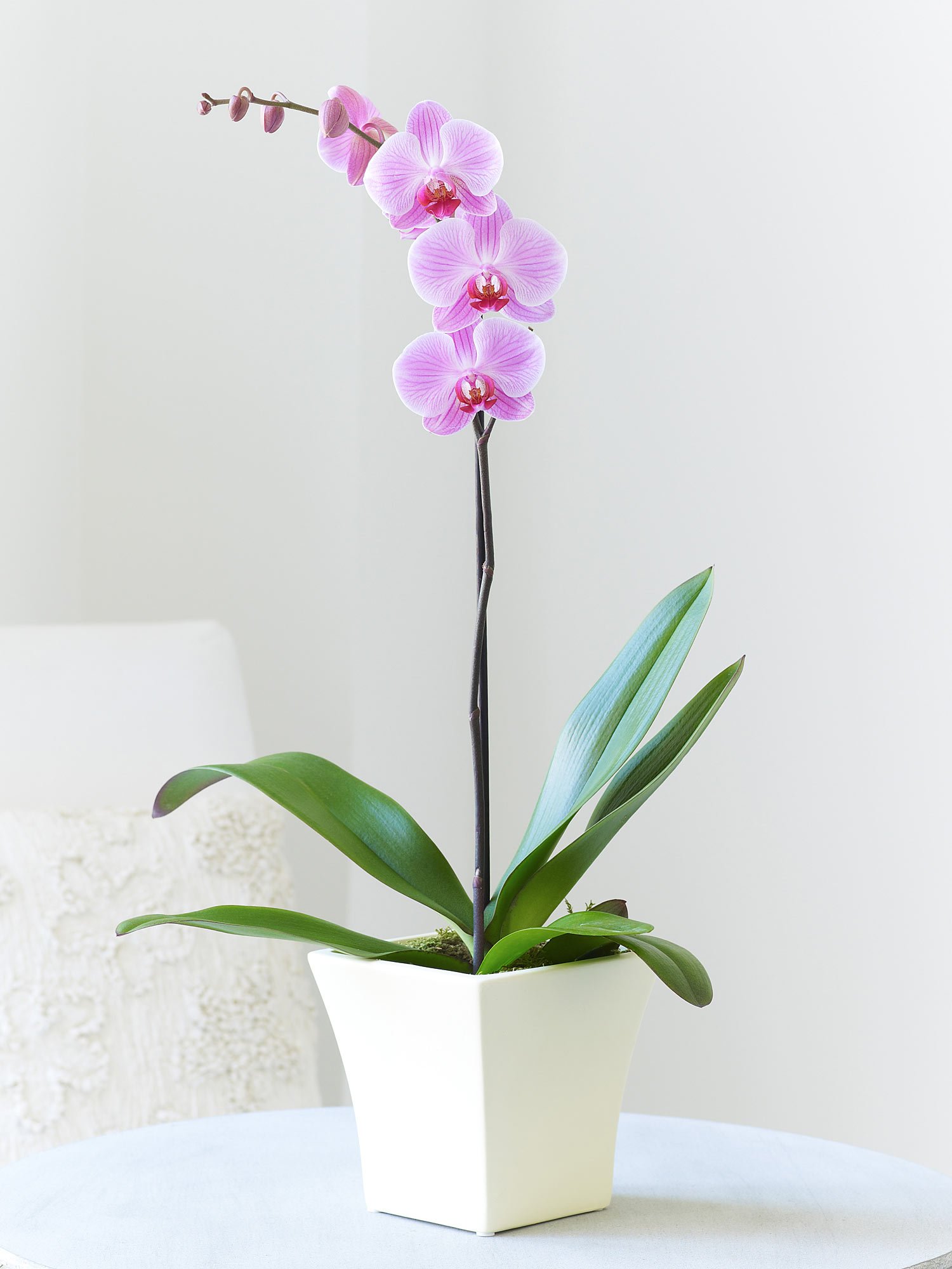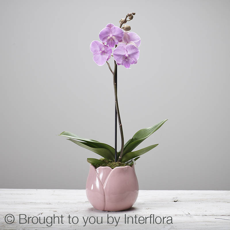 Featuring a beautiful pink phalaenopsis orchid, presented in a ceramic pot.